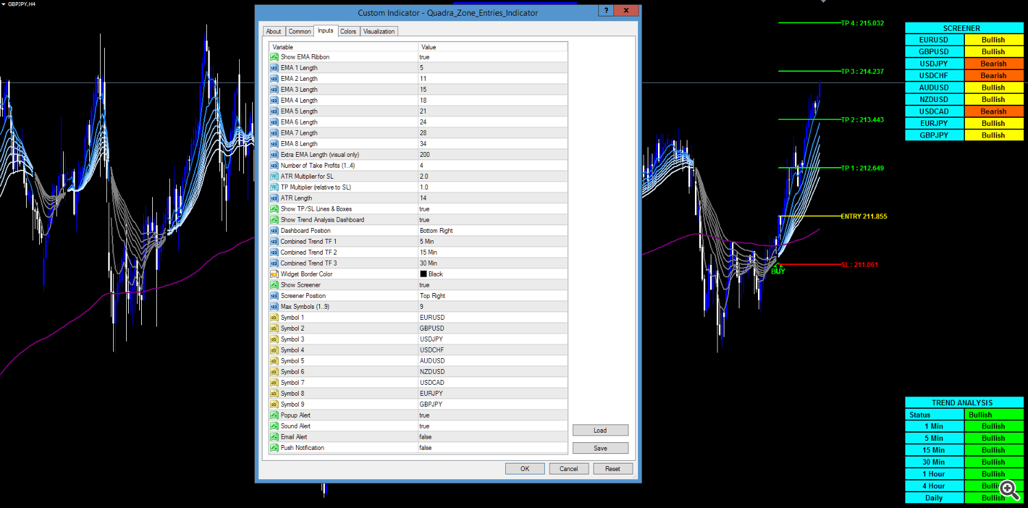 - Fully configurable: all EMA periods, ATR multipliers, TP count, symbols, timeframes, and panel positions are exposed as input parameters