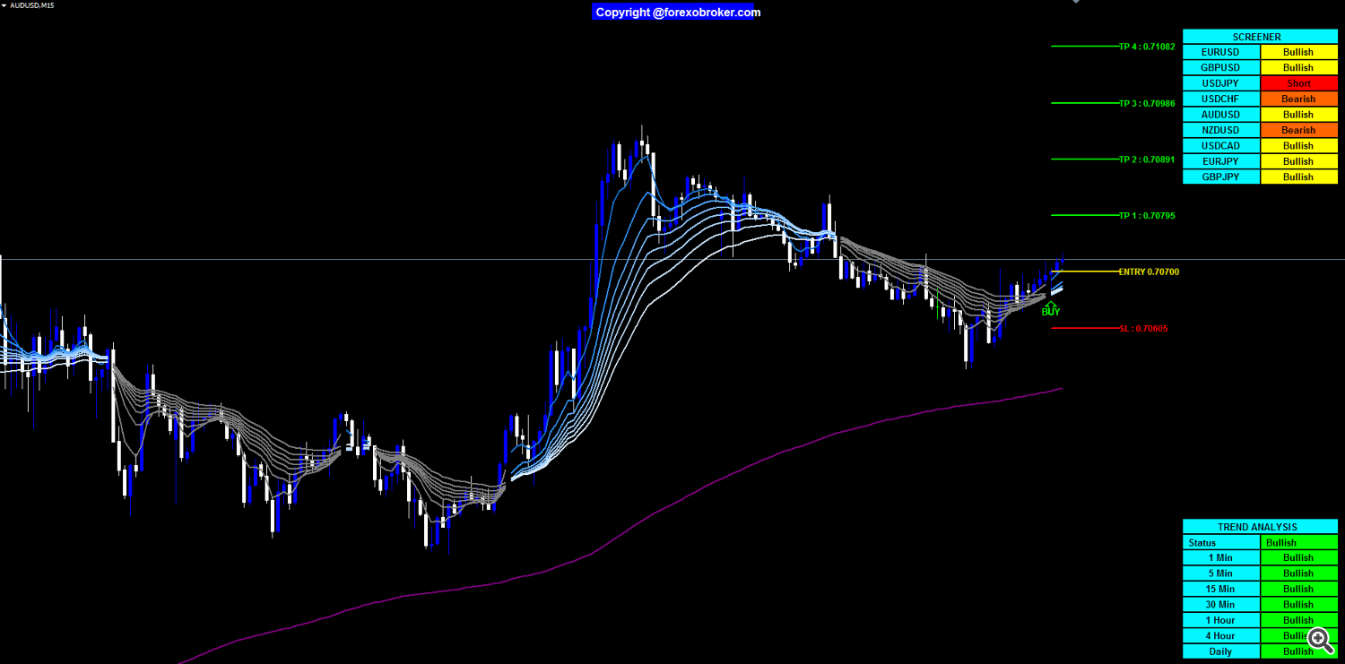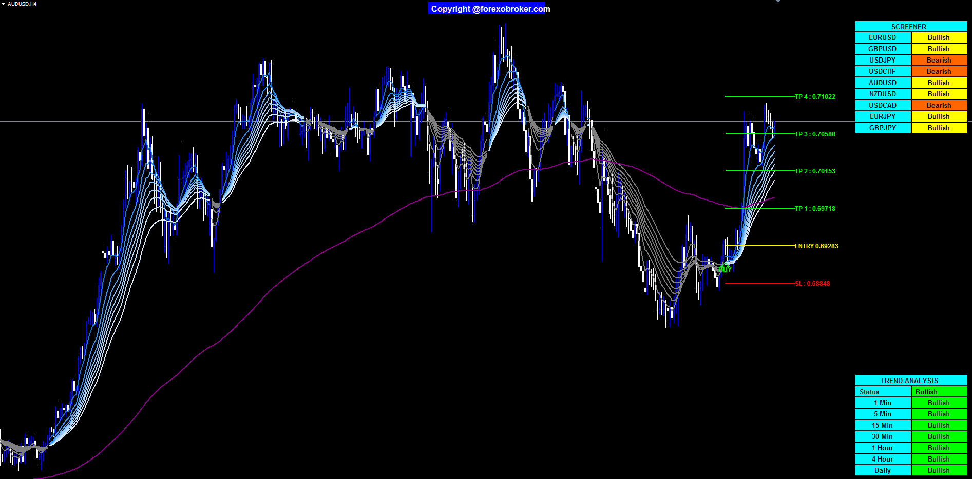 Figure 5: AUDUSD H4. A BUY signal fires as the ribbon begins transitioning from gray to amber after a pullback into the purple EMA 200. The yellow Entry line is marked, four green TP levels step upward, and the red SL line sits below. The screener top-right shows widespread Bullish states across the nine pairs, and the trend dashboard bottom-right reports bullish alignment across the monitored timeframes — the classic high-confidence setup where signal, screener, and dashboard agree in a single chart view.