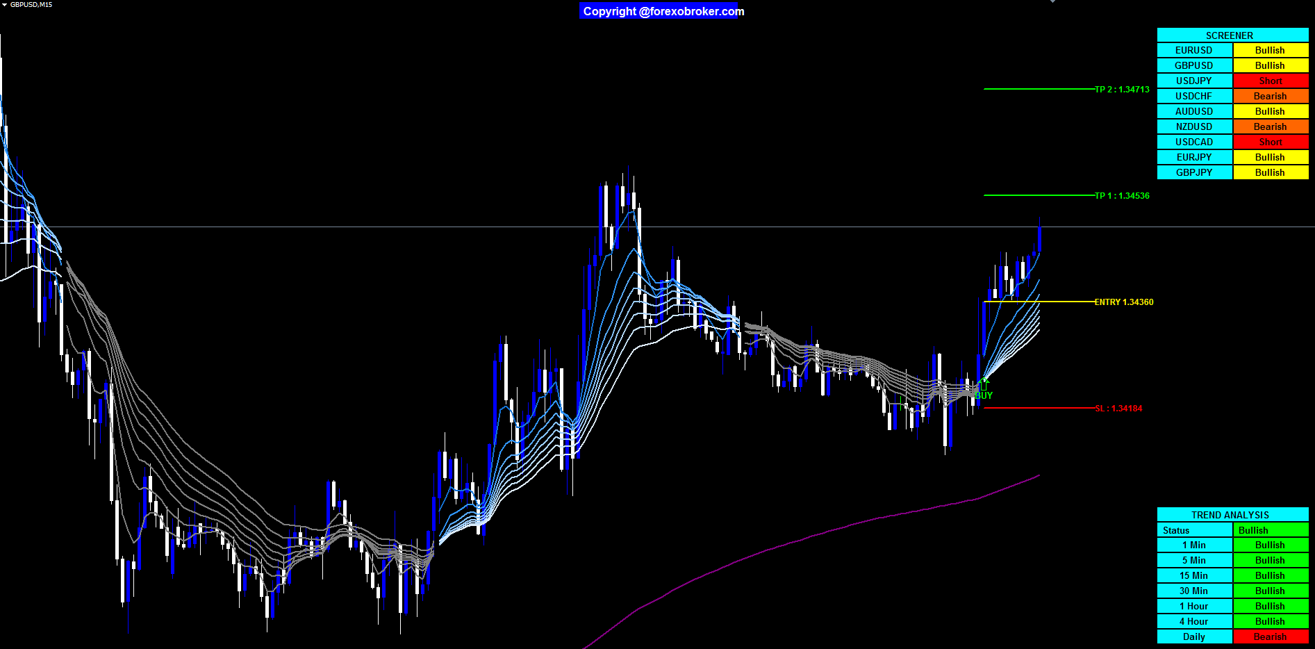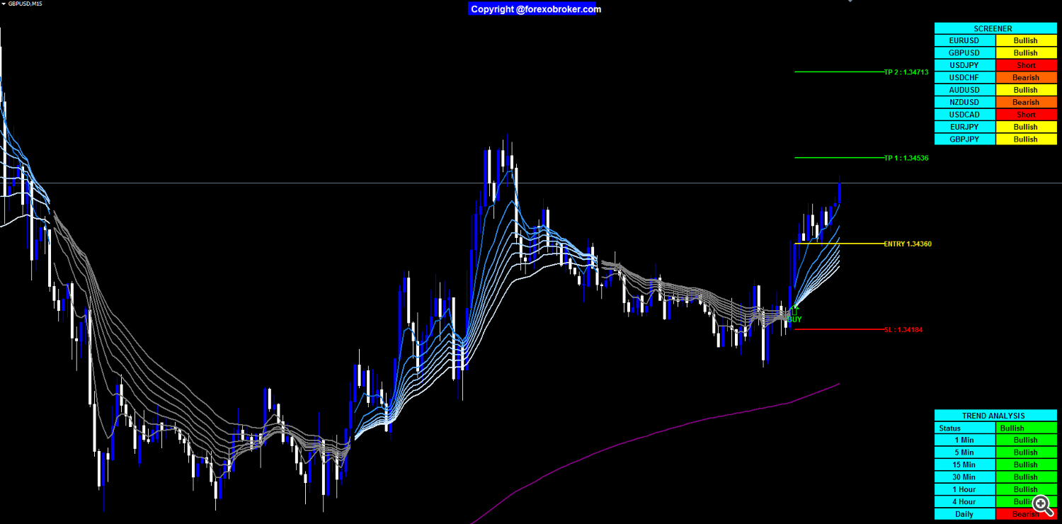 Figure 2: GBPUSD M15 with a BUY signal at the base of a pullback. The ribbon is completing its transition from gray to amber as EMA2 clears EMA8. The yellow Entry line, four green TP levels, and red SL line are drawn automatically from the ATR value at signal bar close. The purple EMA 200 line sits below price, confirming structural bullish bias.