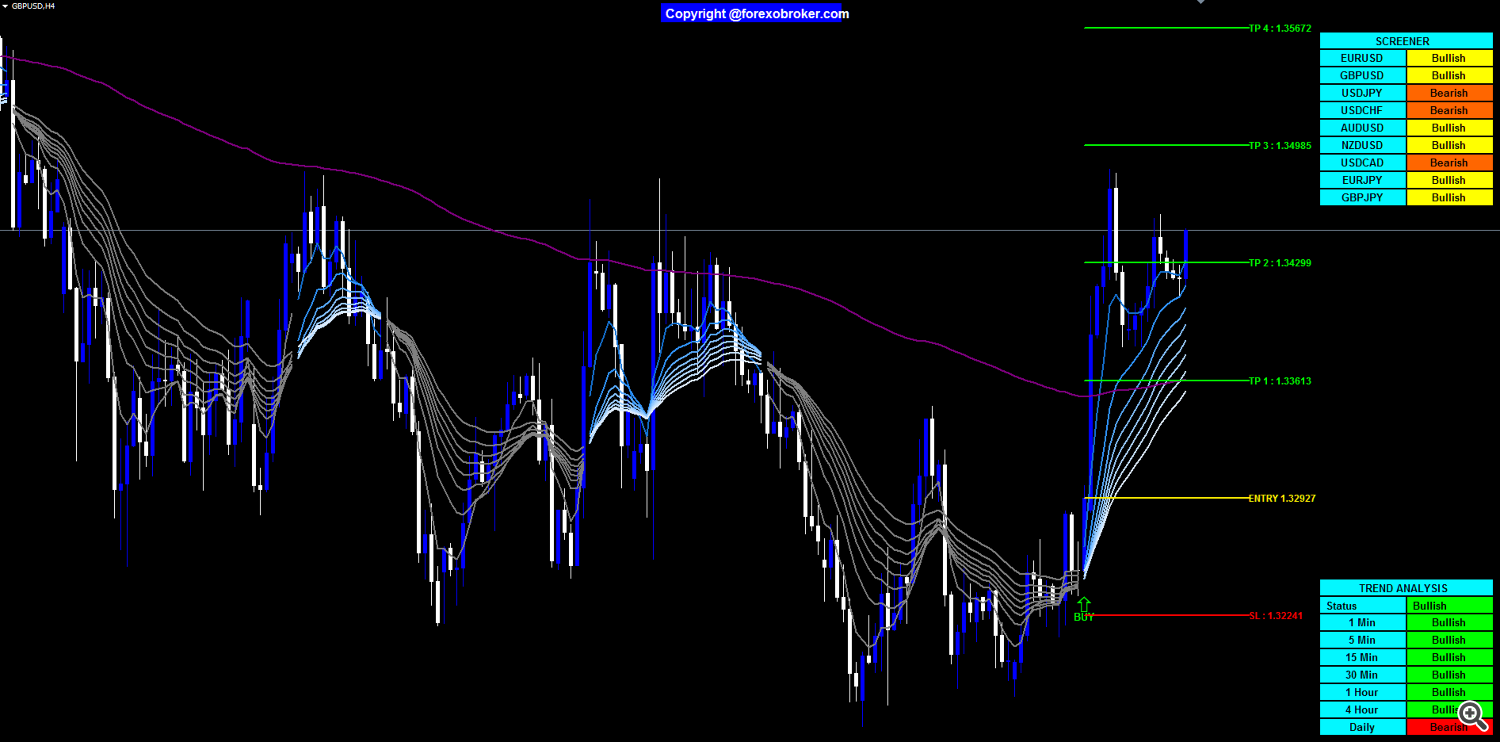 Figure 3: GBPUSD H4 BUY signal. All four TP levels extend to the right in green, the stop loss sits below entry in red, and the yellow Entry line marks the signal bar close. The screener top-right shows uniform bullish state across the nine monitored pairs, and the trend dashboard bottom-right confirms bullish alignment across every timeframe from 5m through Daily — a maximum-confluence setup.