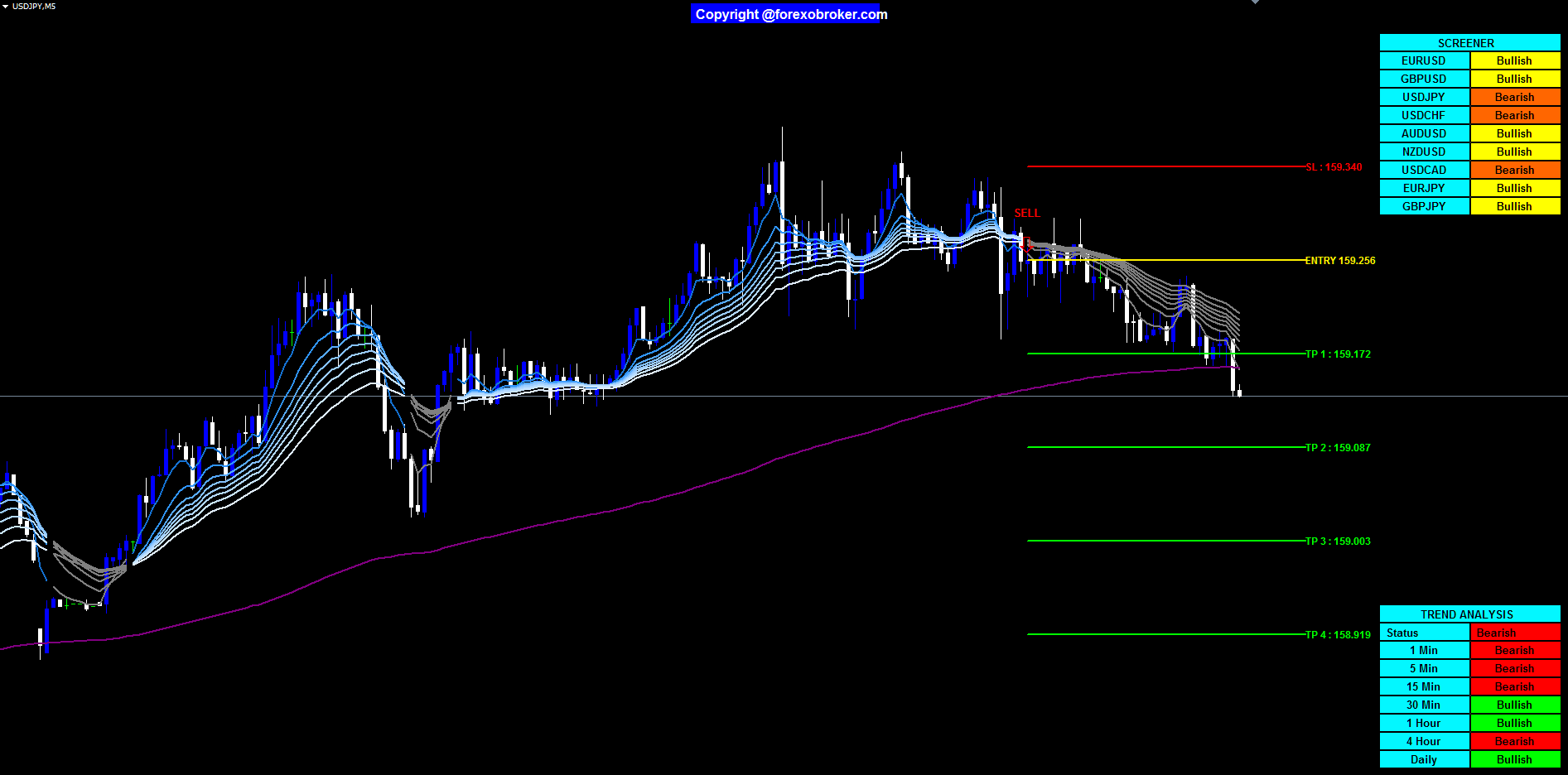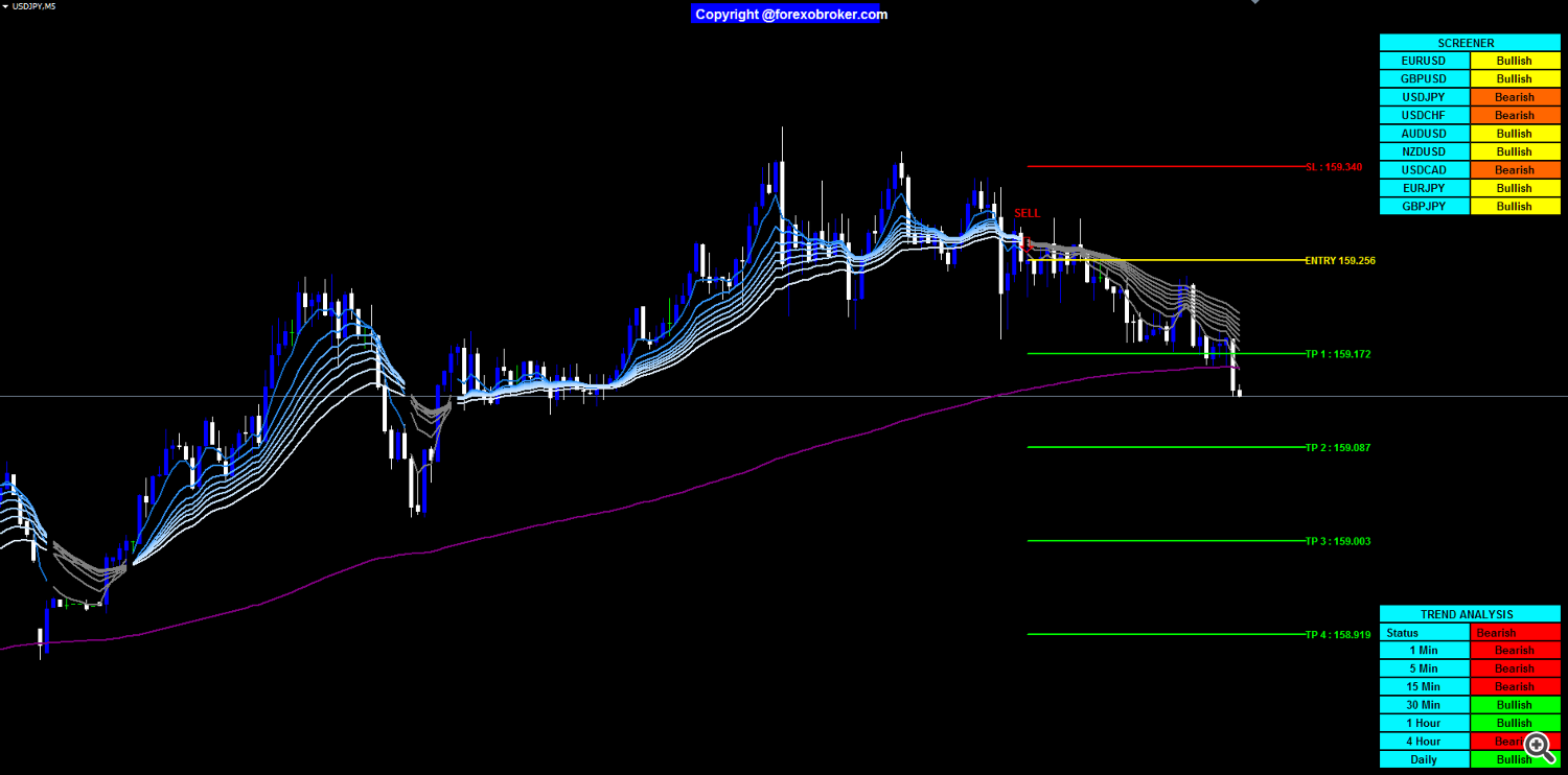 Figure 4: USDJPY M5 SELL signal. The ribbon is gray and the four TP levels step downward below entry with the red SL line above. The screener top-right shows a mix of Bullish and Bearish states across the monitored pairs, giving immediate comparative context that manual chart rotation across nine symbols cannot replicate — each pair's state is snapshotted at the same moment in time.