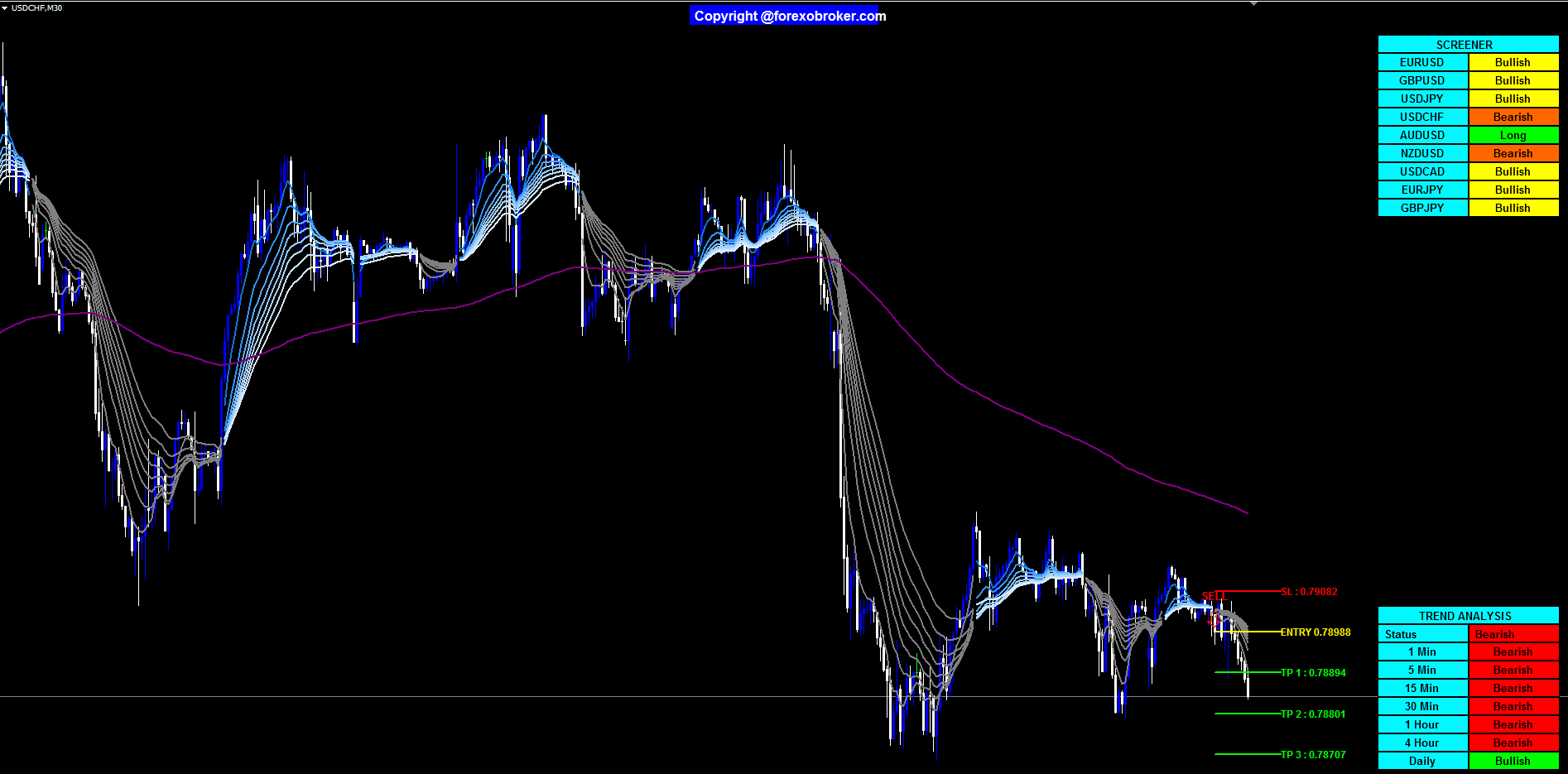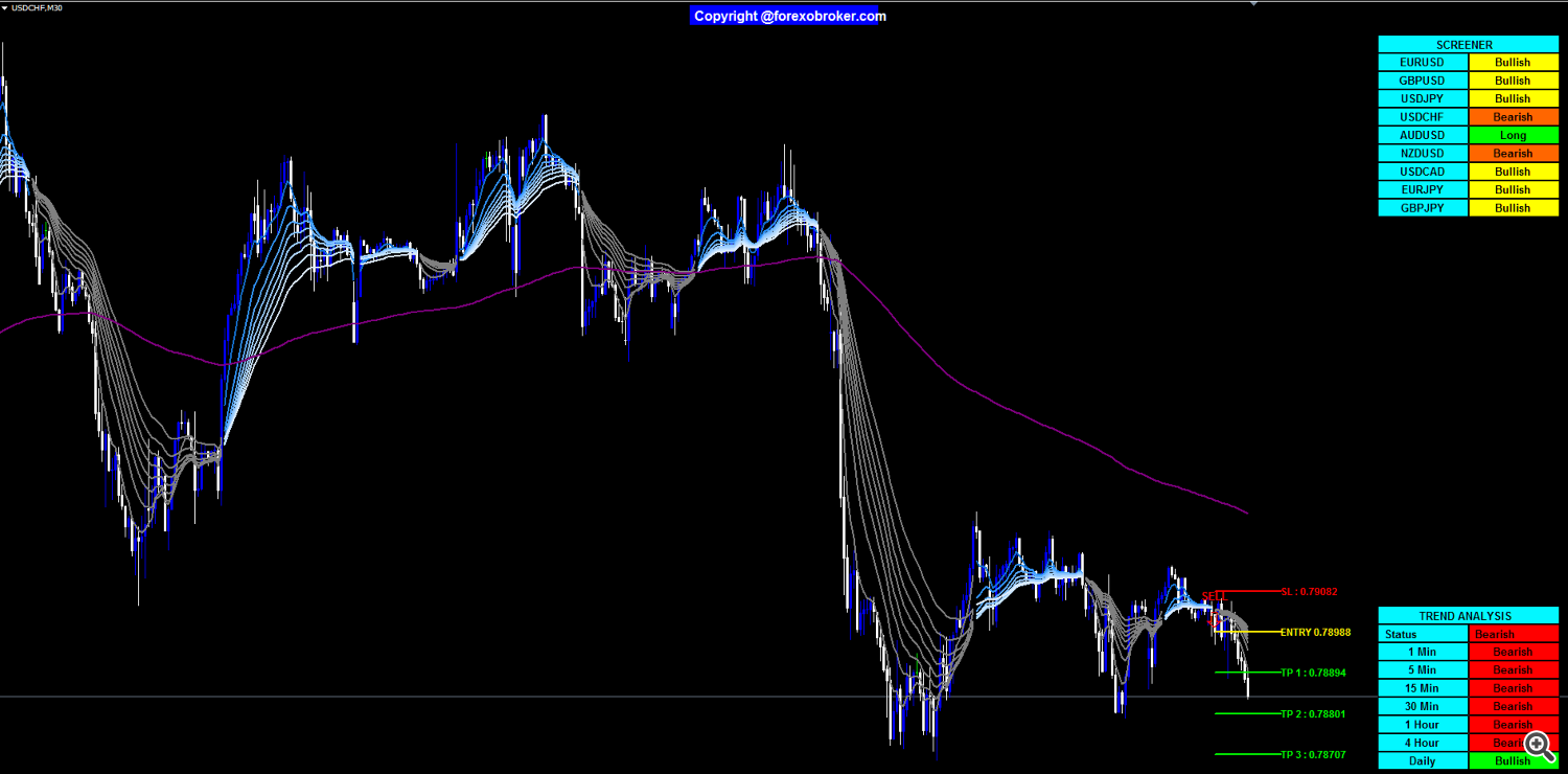 Figure 7: USDCHF M30 SELL signal at the breakdown of an amber-to-gray ribbon transition. The four TP levels step downward below the yellow Entry line and the red SL sits above. The screener in the top-right illustrates the full range of states the panel can display — a mix of Long (live short trade zones on other pairs), Bullish (amber ribbon with no active trade), and Bearish (gray ribbon with no active trade). The trader sees nine parallel narratives at once without switching charts.