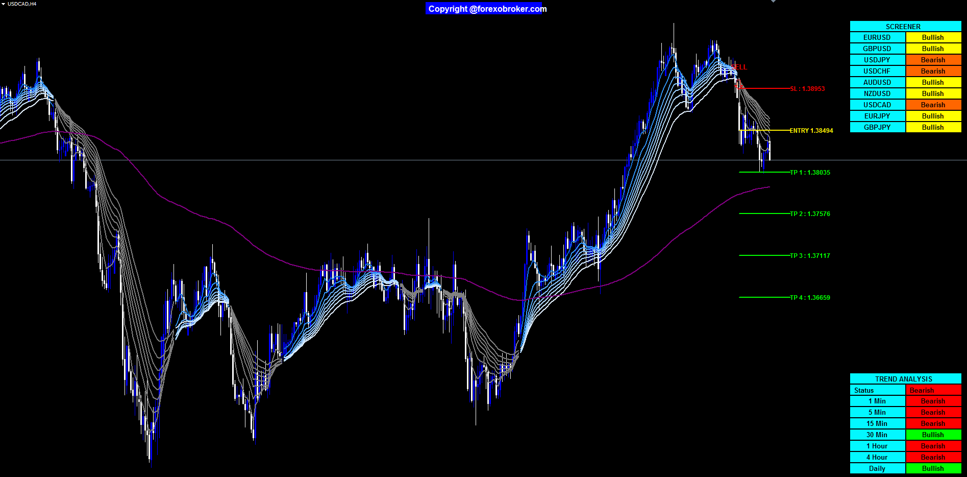 Figure 8: USDCAD H4 SELL signal. The yellow Entry line is marked at signal bar close, four green TP levels step downward toward the lower right of the chart, and the red SL sits above entry. The trend dashboard in the bottom-right reports the ribbon state for USDCAD on 5m, 15m, 30m, 1h, and Daily — each cell color-coded bullish or bearish — with the Status row summarizing the majority vote of the three chosen timeframes.