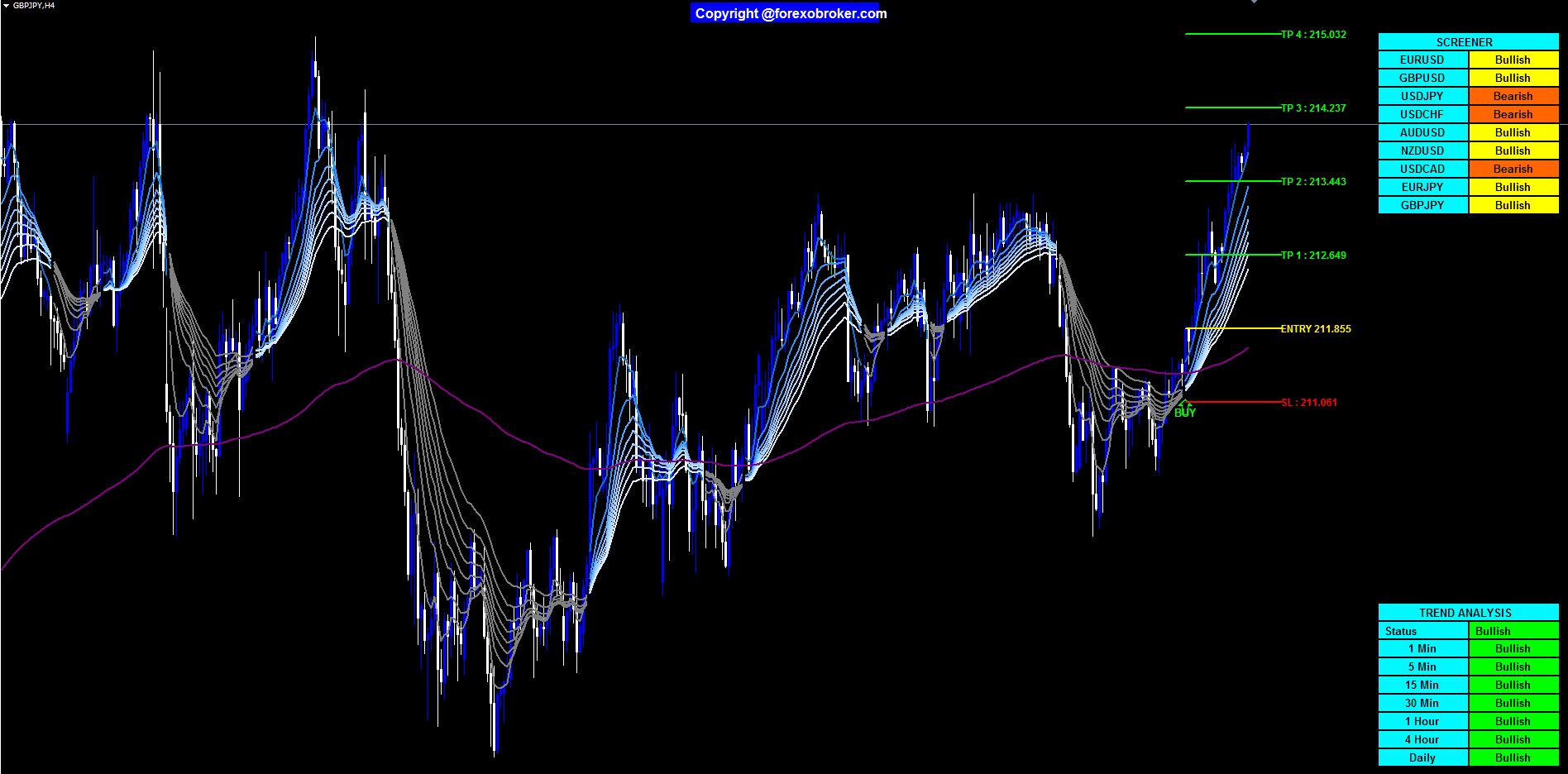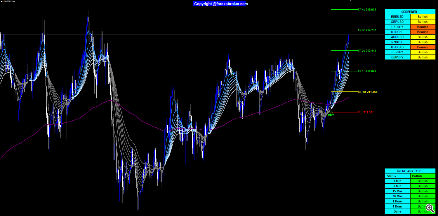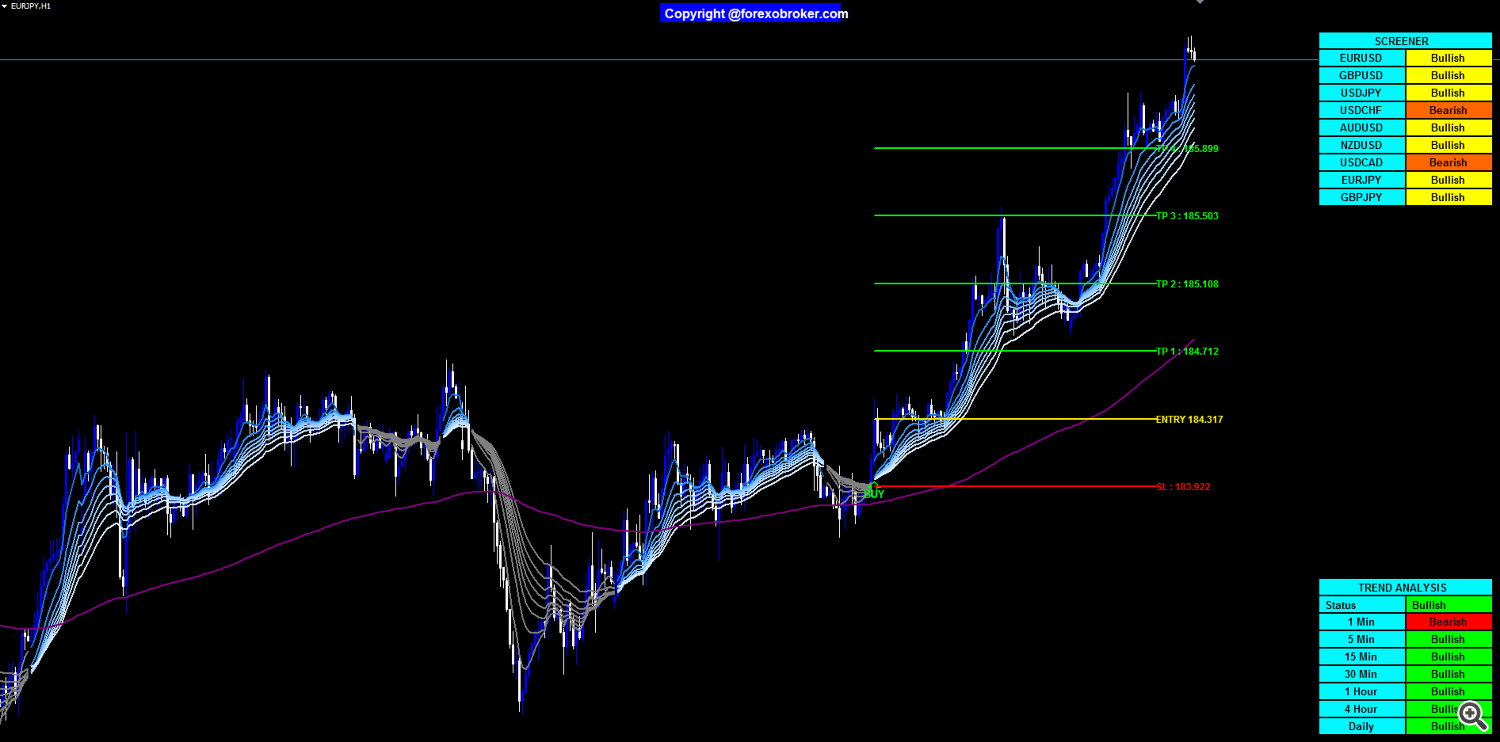 Figure 6: EURJPY H1. A BUY arrow prints as the ribbon completes its transition to full amber. All four TP levels are drawn immediately from ATR at signal bar close, with the red SL line below the yellow Entry line. The trade zone extends right with each new bar, and the screener top-right confirms uniform bullish state across the monitored pairs while the trend dashboard bottom-right shows agreement on all timeframes.
