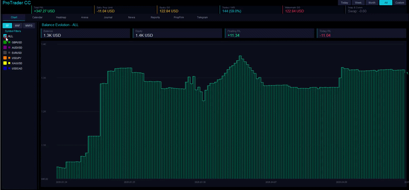 1. Chart - Equity curve with symbol filtering. Select one symbol or multiple symbols from the sidebar to view their performance independently. Time filters: Today, Week, Month, All.