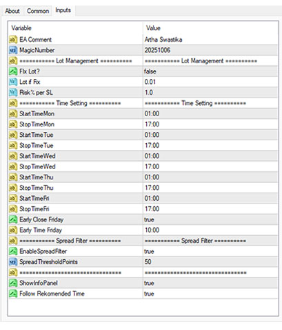 This guide explains each input parameter available in the Artha Swastika Expert Advisor (EA). Understanding these settings will help you configure the EA properly according to your trading preferences and broker conditions.