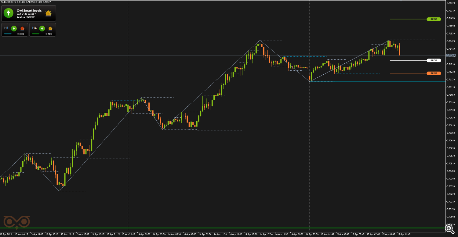 The fourth signal on AUDUSD was also received on April 15. It was weak and did not meet the conditions for a quality entry. In this case, the entry point was formed near the end of the trading day, when the market often loses momentum and the remaining distance to targets becomes noticeably smaller. For this reason, such a scenario is classified as low-probability and deliberately skipped.