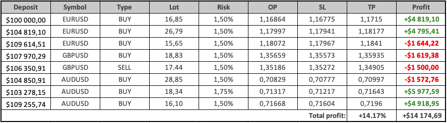 A total of 8 trades were opened during the week. Of these, 4 trades closed in profit and 4 trades were closed by StopLoss. The overall result for all trades amounted to +$14 174.69, which equals +14.17% on the deposit.