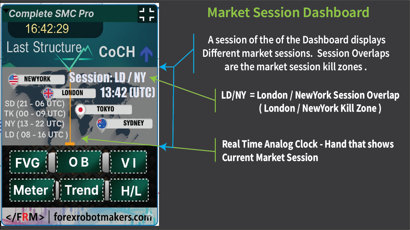 The dashboard carries a market session area that displays all major trading sessions (Sydney, Asian, London, New York) and detects the current trading session. A vertical line is automatically drawn to help you identify the current market session thereby giving idea of high-volatility periods, session overlaps, and when institutional activity is most likely to occur.