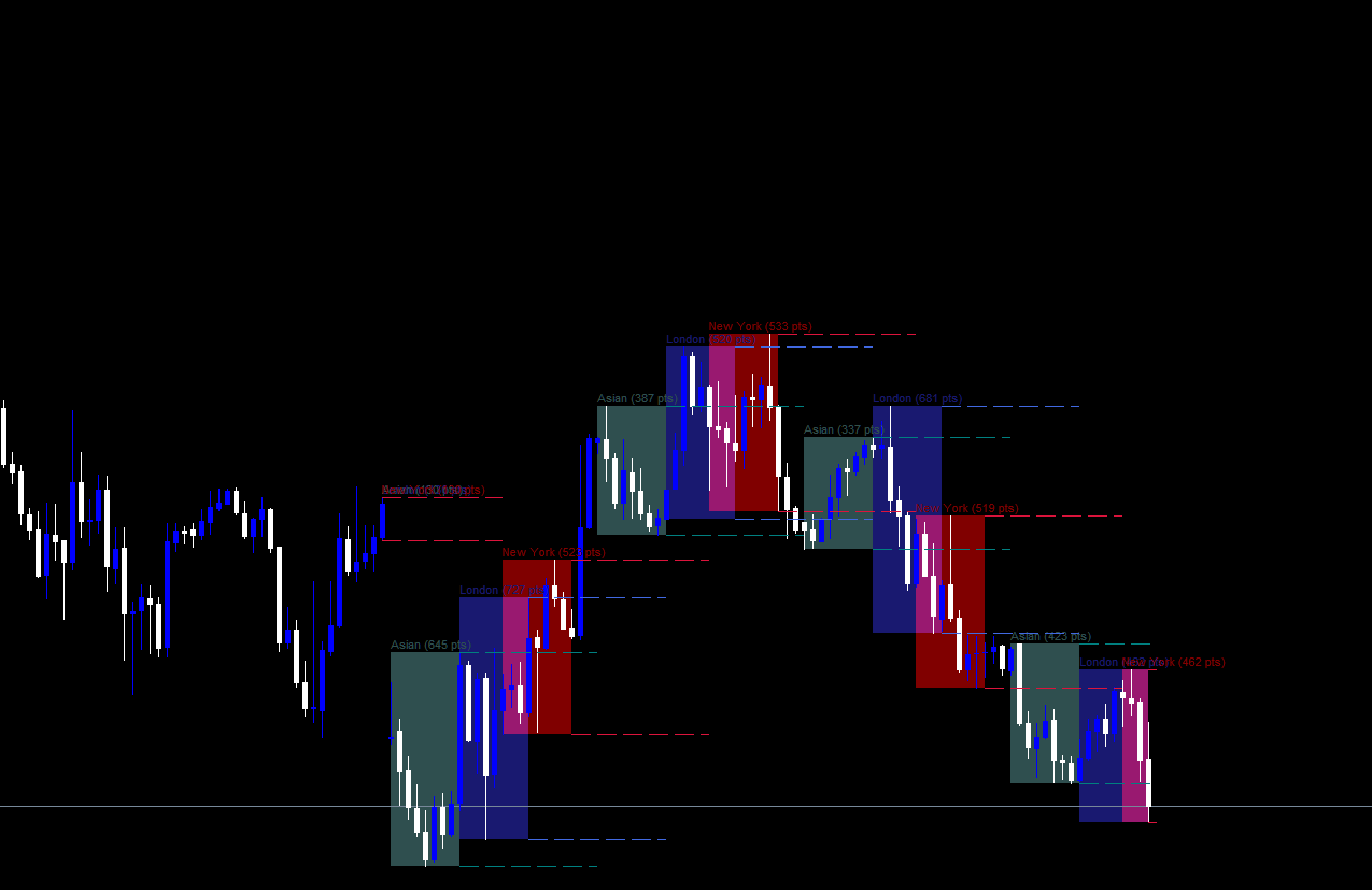 Draws colored rectangular boxes for the Asian, London, and New York trading sessions with high/low range extension lines. Essential for session-based breakout strategies and understanding market structure.