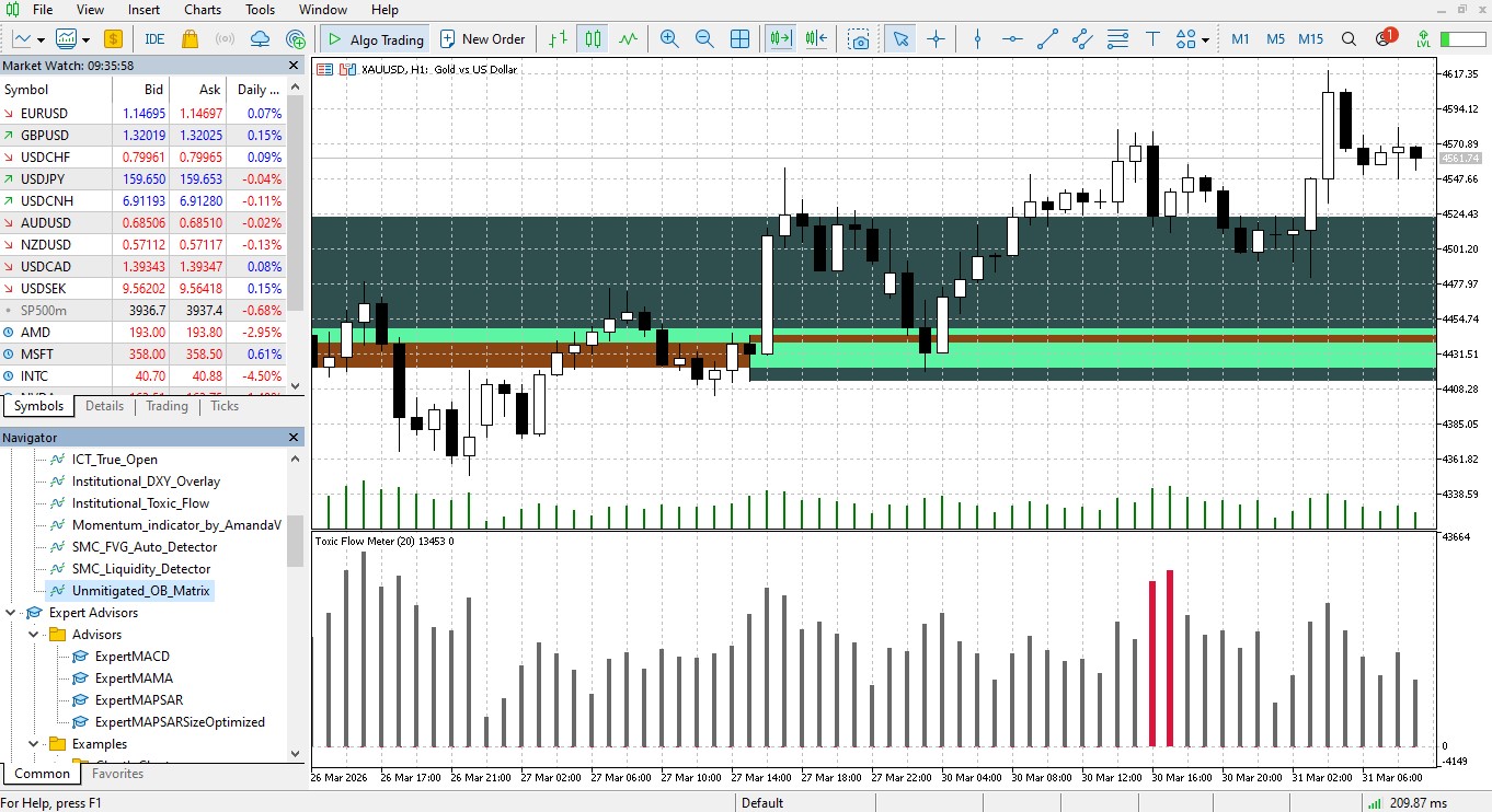 What makes this architecture genuinely powerful is the dynamic mitigation tracking system operating entirely in the background, the exact millisecond the price action retraces and taps into a previously established block, the indicator recognizes that the pending liquidity has been consumed, it immediately registers the zone as mitigated and removes the visual projection from your terminal, your screen remains relentlessly focused on fresh and unmitigated areas of interest. You can deploy this matrix across any standard timeframe to conduct a professional top-down liquidity analysis without ever suffering from the visual fatigue of overlapping historical boxes.