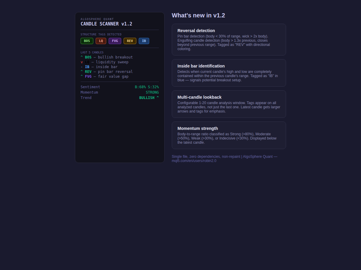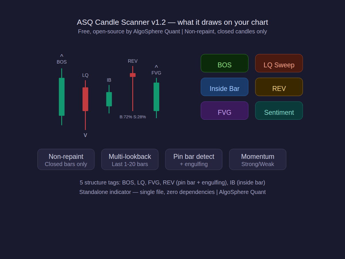 Every candle tells a story. ASQ Candle Scanner reads it for you — tagging liquidity sweeps, breaks of structure, fair value gaps, reversal patterns, and inside bars directly on your chart. Non-repaint: only fully closed candles are analyzed. Multi-candle lookback shows you the last N bars at a glance.