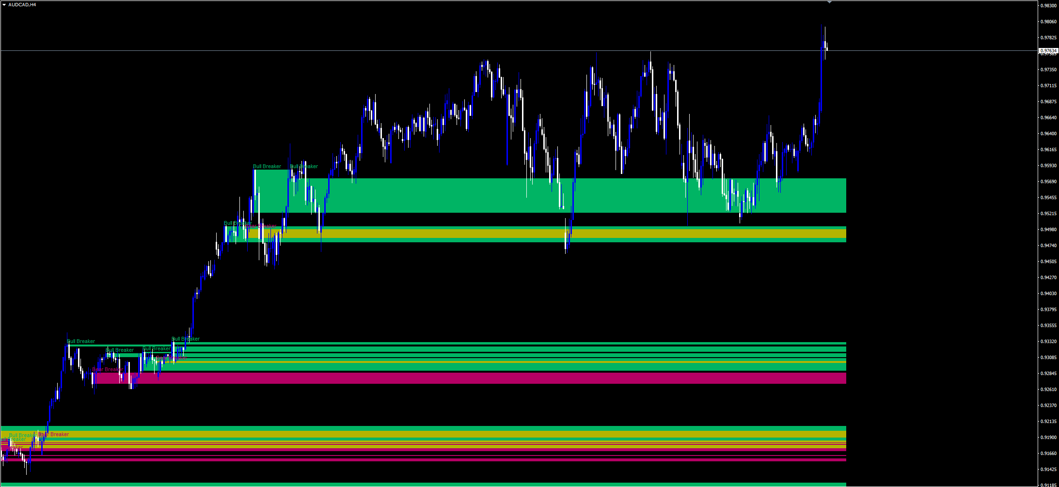 Breaker blocks represent institutional position unwinding. When their OB fails, institutions flip direction — the breaker zone marks where they re-enter. Completes the SMC toolkit alongside BOS and Order Blocks.