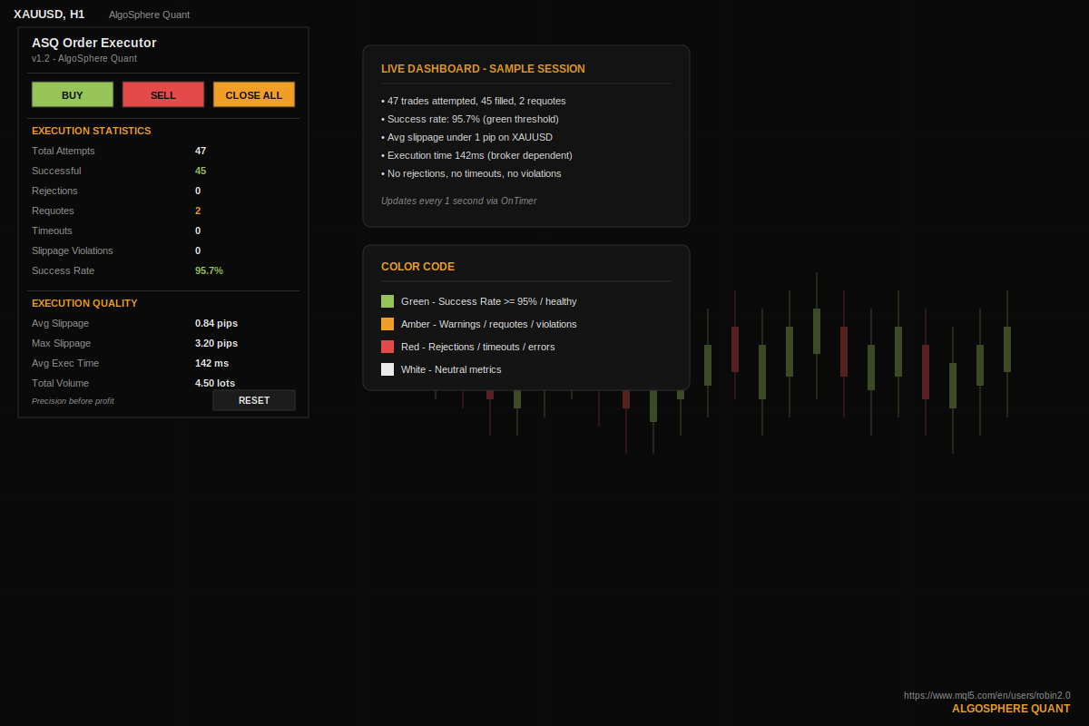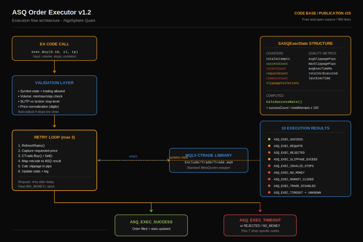 This is the open-source execution engine behind Quant Athena Gold v2 on the MQL5 Market. Same retry logic, same slippage control — the Market version adds the CORTEX AI adaptive execution layer.