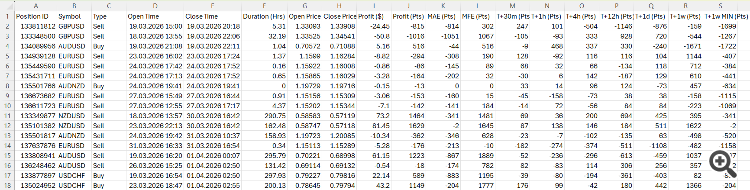 Output Format: The script generates a CSV file with the following columns: Position ID | Symbol | Type | Open Time | Close Time | Duration (Hrs) | Open Price | Close Price | Profit ($) | Profit (Pts) | MAE (Pts) | MFE (Pts) | T+30m | T+1h | T+4h | T+12h | T+1d | T+1w | T+1w MIN