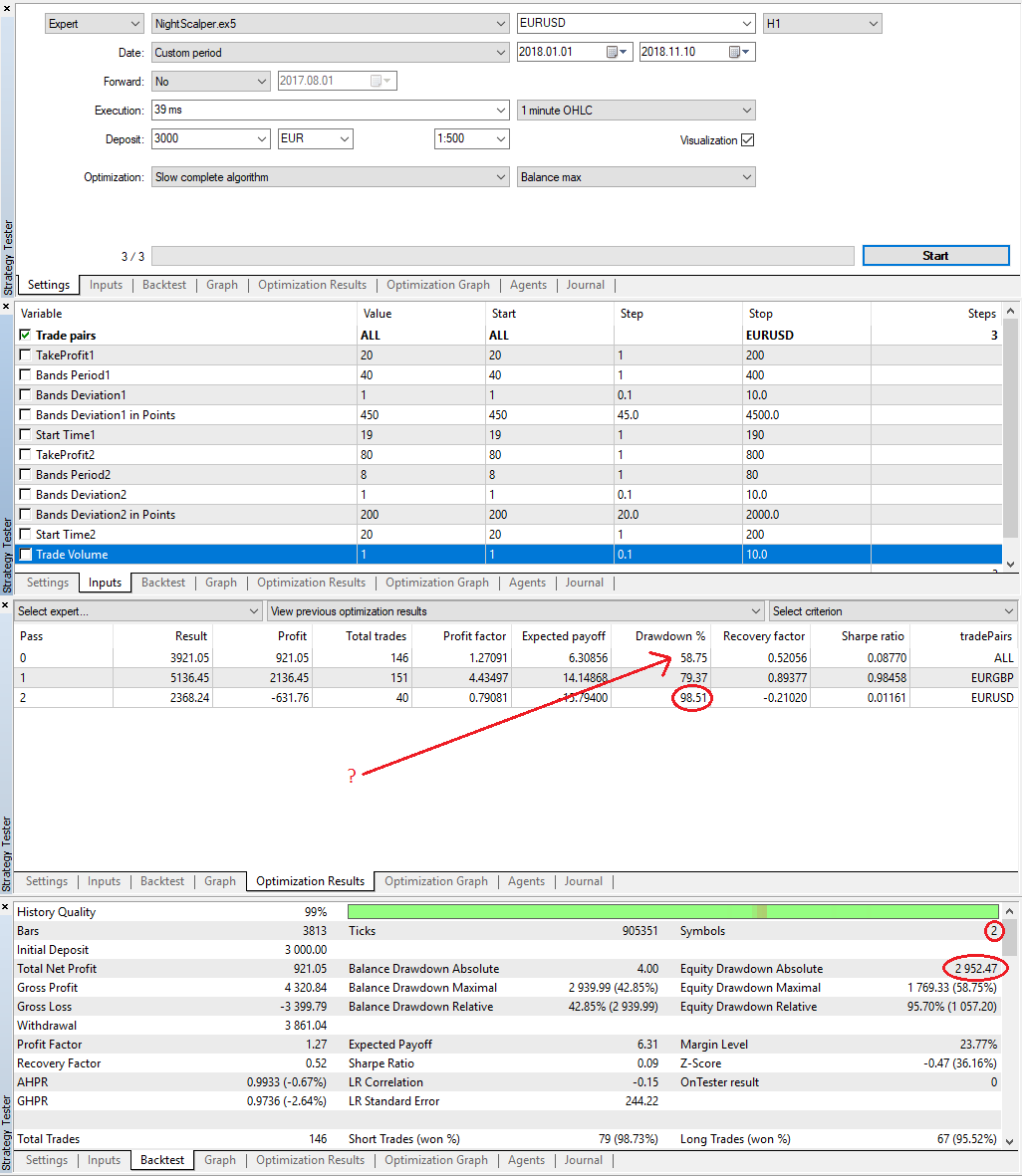 I am trying to make sense of the draw down calculation. The optimisation screen shows 3 passes, 1 for each symbol seperate and 1 trading both symbols.