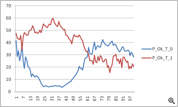 It looks like an inverse correlation - the reason is not clear. Also noteworthy is the strong drop in the chance of choosing a good quantum segment for target "0" up to about 40 iterations - at the bottom the chance is in the range of 5%, which is very small, at 2/3 there is a return to the original probability. This spread is surprising, as is the pronounced dynamics over many iterations.