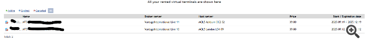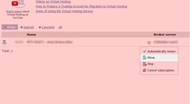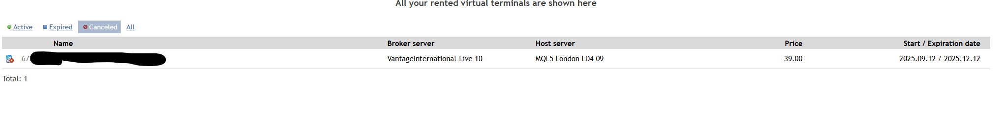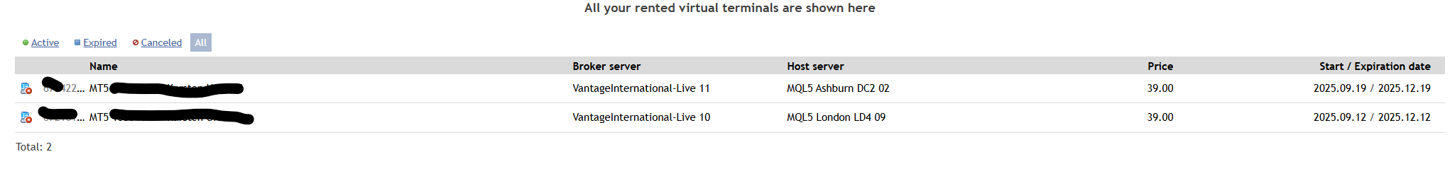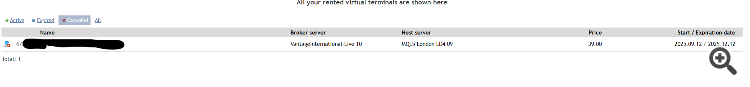 - User can temporarily stop and re-launch the Virtual terminal via the client one. The Rental period is not extended in that case. All the terminal activity is displayed in Expert Advisor and terminal logs.