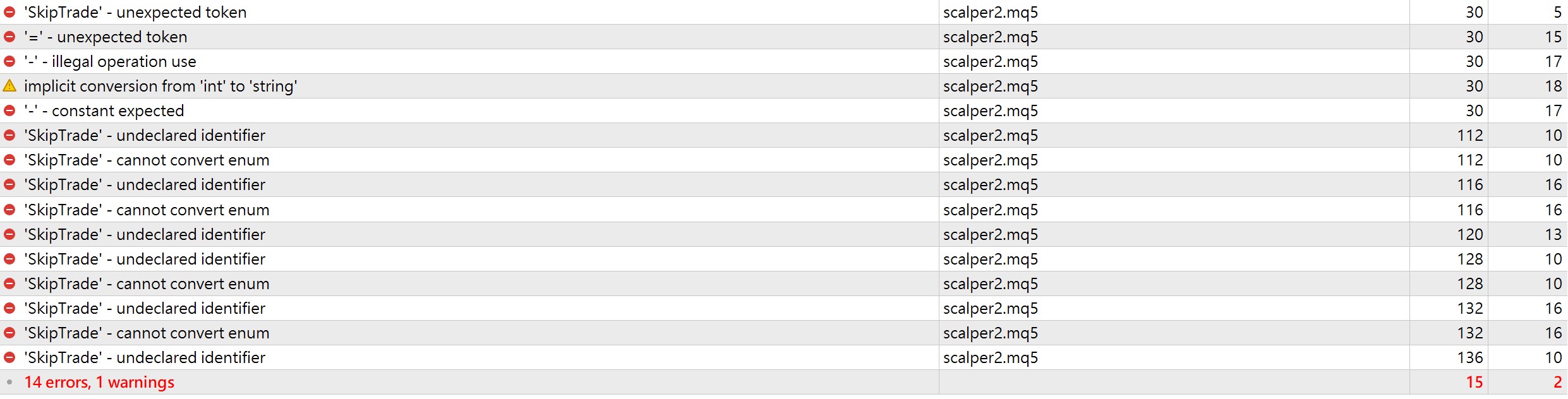 input double InpVolume = 0.01; input string InpTradeComment = "M1 Scalper"; // <-- Missing semicolon int SkipTrade = -1;