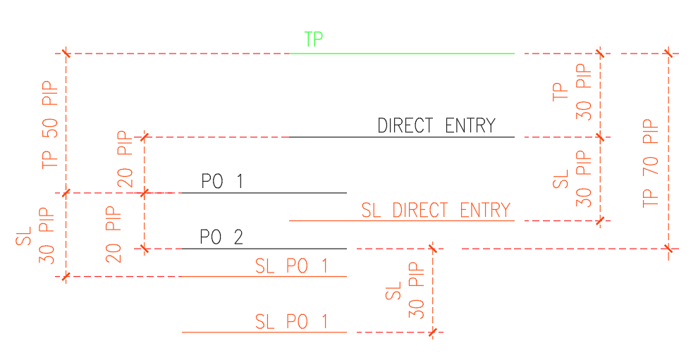 and then place limit order PO1 & PO2 with 20pips distance and SL 30pips but the TP is follow direct entry.
