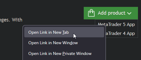 Right-click on the MT5 or MT4 button, and choose "Open link in New Tab", and it will open the page correctly.