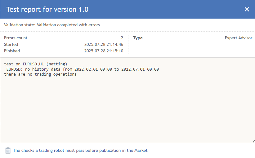 The checks a trading robot must pass before publication in the Market