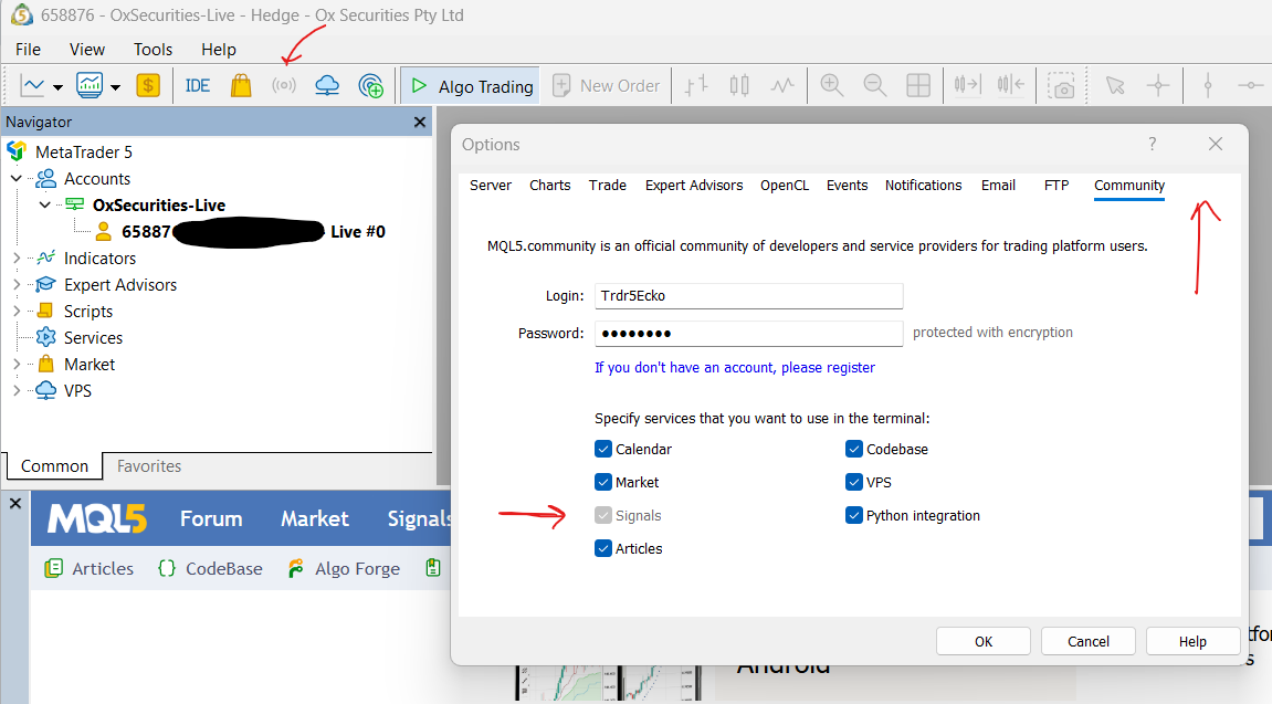 - click (in Metatrader) on Tools - Options - Community (to be sure that it is ticked for Signals);