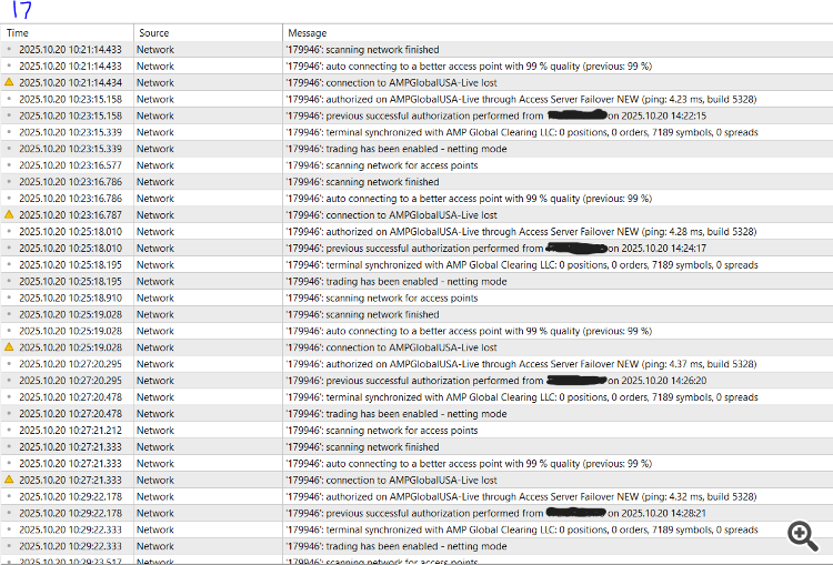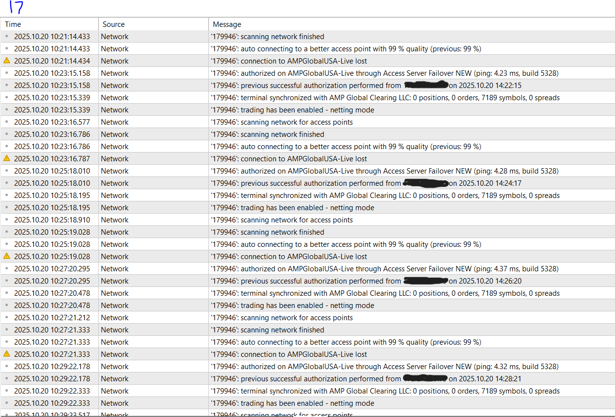 EDIT: However, if by 2 companies you mean 2 brokers, then, I would go back to the normal assumption that your network and/or your internet provider has serious ongoing issues. Or if you are using wifi, then that is more likely the cause.without any errors in those logs, then, normally you would assume it is your network and/or your internet connection, however, I am well aware of intermittent issues with that broker over the years. They may not have fixed their bandwidth or internet connection issues which i know from personal experience with that broker -- was going on 7 years ago. The issue -- at least back then -- was intermittent and would be gone for a month, but then was doing same as you show for couple weeks and then good again for another month.