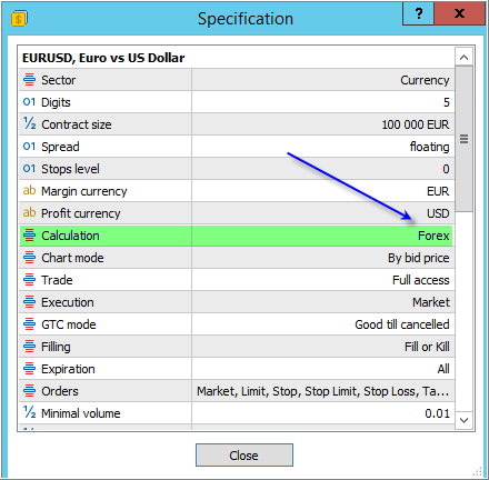 Let's check specification for EURUSD (right mouse click on "EURUSD" in the Market Watch - Specification):