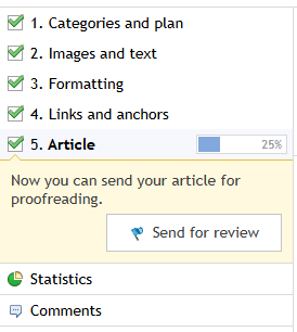 The first thing that comes to mind is that you may not have confirmed that you have read the rules (5 tabs visible in my screenshot) @Vladislav Boyko #: Am I correct in understanding that you are claiming that you do not have a "Send for review" button? If so, please post a screenshot similar to mine. I have a half-page draft, and even that has a "Send for review" button. From this, I can conclude that the presence of the button doesn't depend on the article's length.The first thing that comes to mind is that you may not have confirmed that you have read the rules (5 tabs visible in my screenshot)