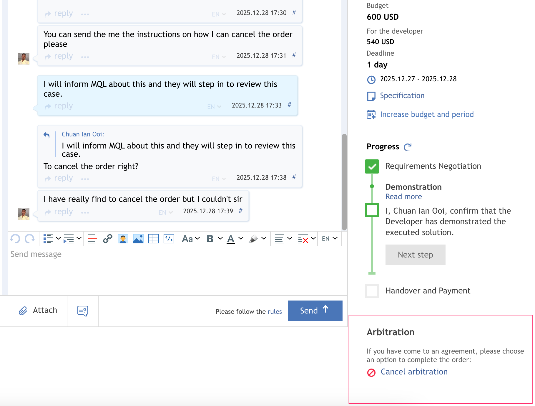 After several back-and-forth discussions, the developer eventually agreed to cancel the order. However, at this point, neither of us has the option to cancel the job manually. The only available option shown is arbitration (please refer to the screenshot below).