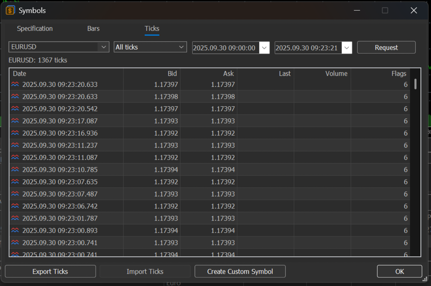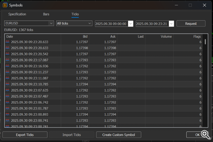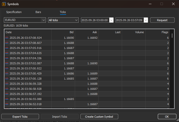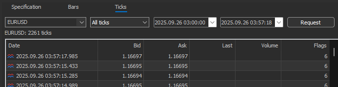 2026.01.03 15:54:04.096 Core 01 2025.09.26 03:57:17 bar = 0 maxAsk = 1.16697 start = 2025.09.26 03:00:00 copiedTicks = 2261