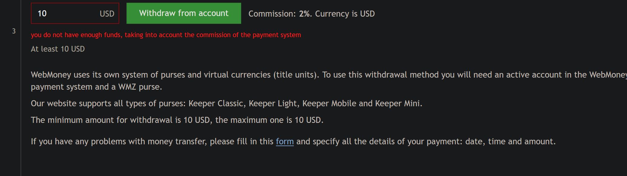 The minimum amount for withdrawal is 10 USD, the maximum one is 10 USD.