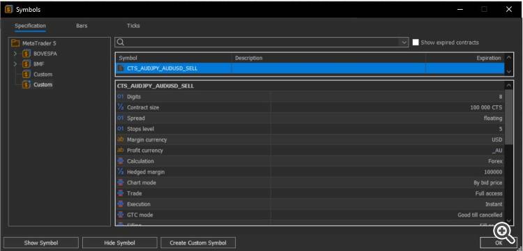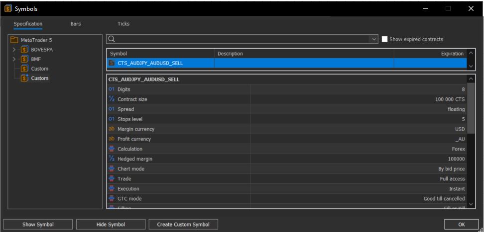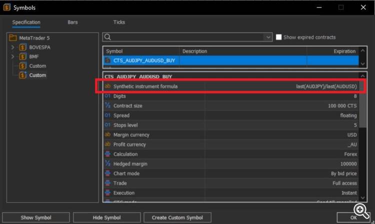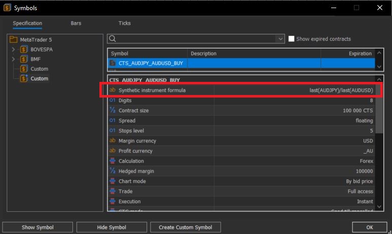 This is a symbol created importing the JSON file exported by the MT5 (The JSON file contains the "Formula" field, but MT5 does not create the "synthetic instrument formula" field: