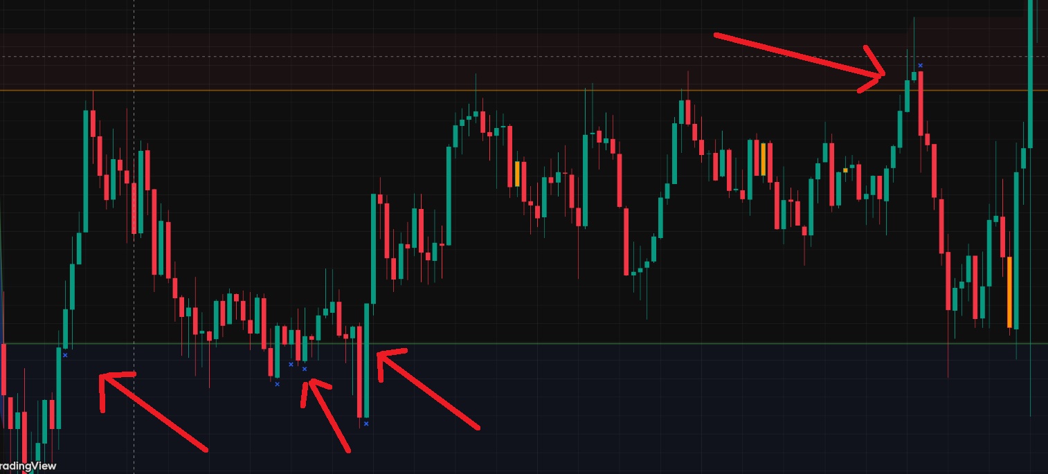 We define a zone of interest between the low of the day and the upper level of the open of the last 1-hour candle. When the price opens a candle (1M, 5M, 15M, or 30M, depending on what we choose) inside this zone and then breaks above the upper boundary, we open a buy trade.
