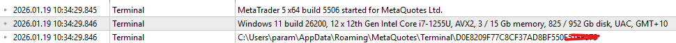 2026.01.17 12:03:26.315 log file "C:\Users\rohit\AppData\Roaming\MetaQuotes\Tester\D7ED78B5721D43771AFED1937E52A4FF\Agent-127.0.0.1-3000\logs\20260117.log" written