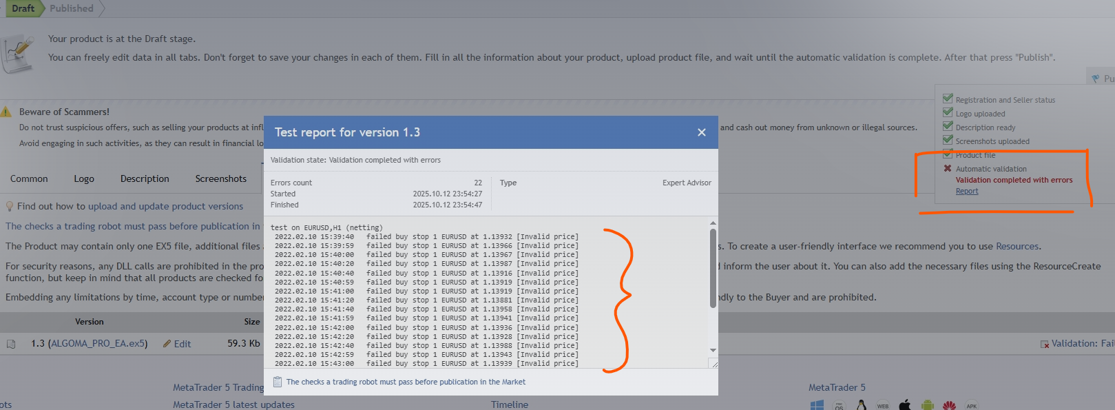 I have an issue when I would like to Upload My Ea to the platform, I get some errors as Price unavailable as shown in the image, as known My EA work without any problem in Gold and Forex markets prices.