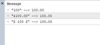 void OnStart() { test("100"); test("$100.00"); test("$ 100 $"); } void test(string str) { PrintFormat("\"%s\" --> %.2f", str, StringToDoubleClean(str)); } double StringToDoubleClean(string val) { string clean = val; // Remove currency symbols and spaces StringReplace(clean, "$", ""); StringReplace(clean, "%", ""); StringReplace(clean, " ", ""); // Convert to double (This is where Build 5577 fails with Regional Settings) return StringToDouble(clean); }