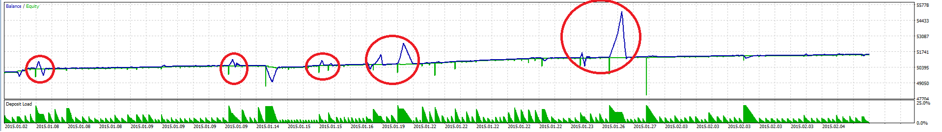 I'm using a hedging account with Forex.com and don't understand what these spikes could mean in the strategy tester. The backtest data is also completely off showing profits and losses not displayed on the graph. Any help is greatly appreciated!