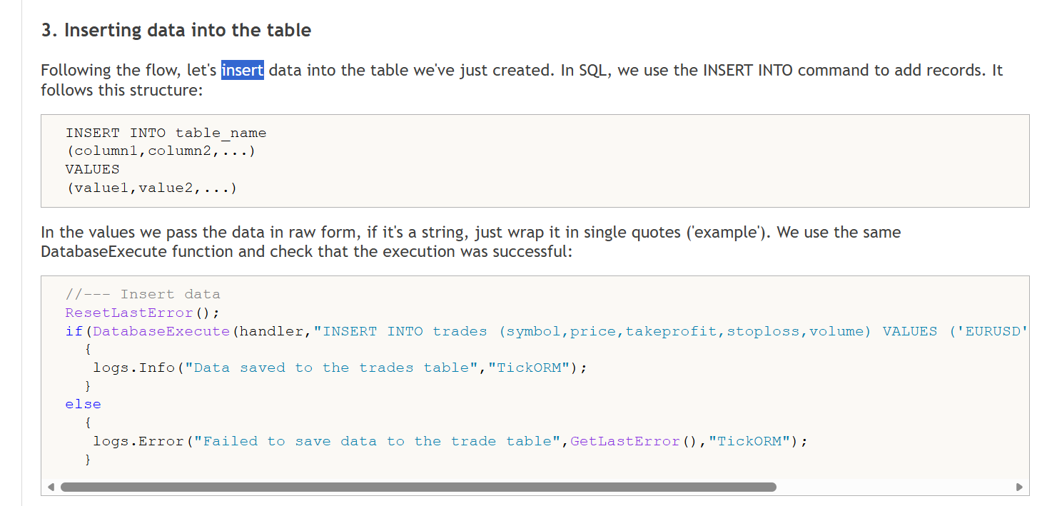 int x = 1; string name = "Paul"; int age = 32; string address = "California"; double salary = 25000.00; DatabaseBind(db, "INSERT INTO COMPANY (ID,NAME,AGE,ADDRESS,SALARY) VALUES (?,?,?,?,?)", x, name, age, address, salary);I think this is more like an SQL problem than a mql5.