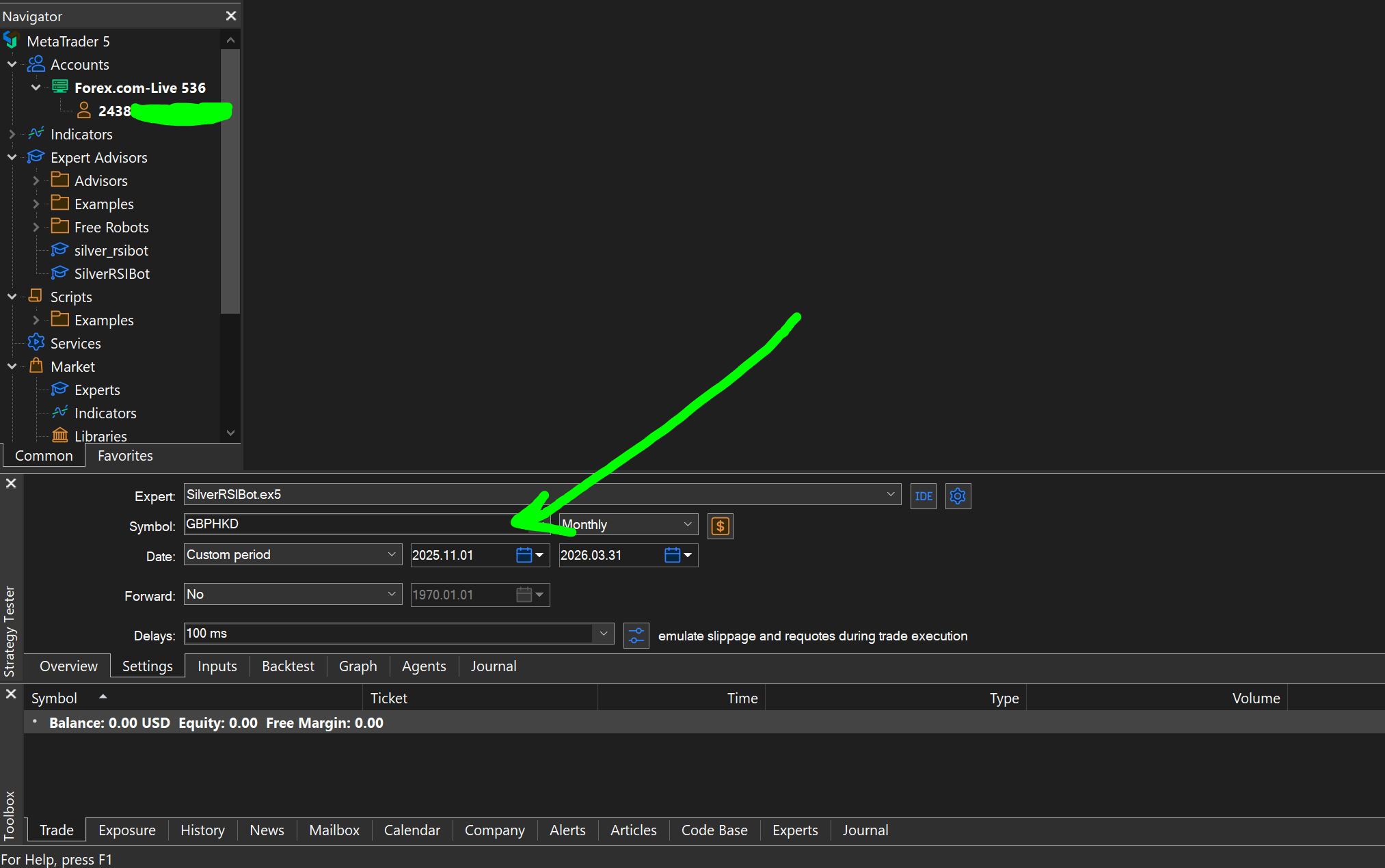 Hi guys, excuse me if this is a silly question as I am new to the MetaTrader gui, but I am having trouble changing the Symbol under my Strategy Testing settings, pls see my screenshot.