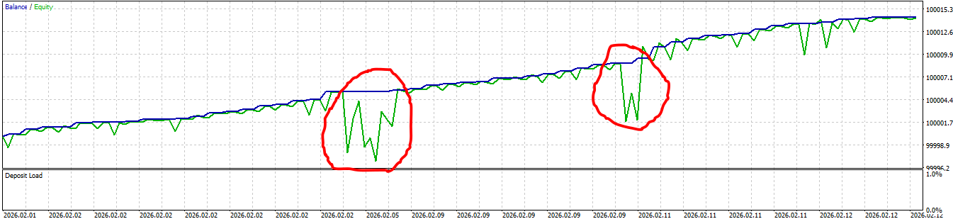 This is an easy way to visually spot problems. These unrealized equity losses are a warning signal. In those 2 situations the market eventually reversed in the trade direction but the danger of big losses was there. Next time the trader might not be lucky.