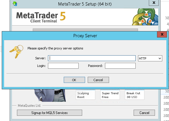 We are experiencing an issue when installing MetaTrader 4 and MetaTrader 5 on a VPS. During installation, the setup repeatedly prompts for proxy server configuration, even though no proxy is configured on the system.