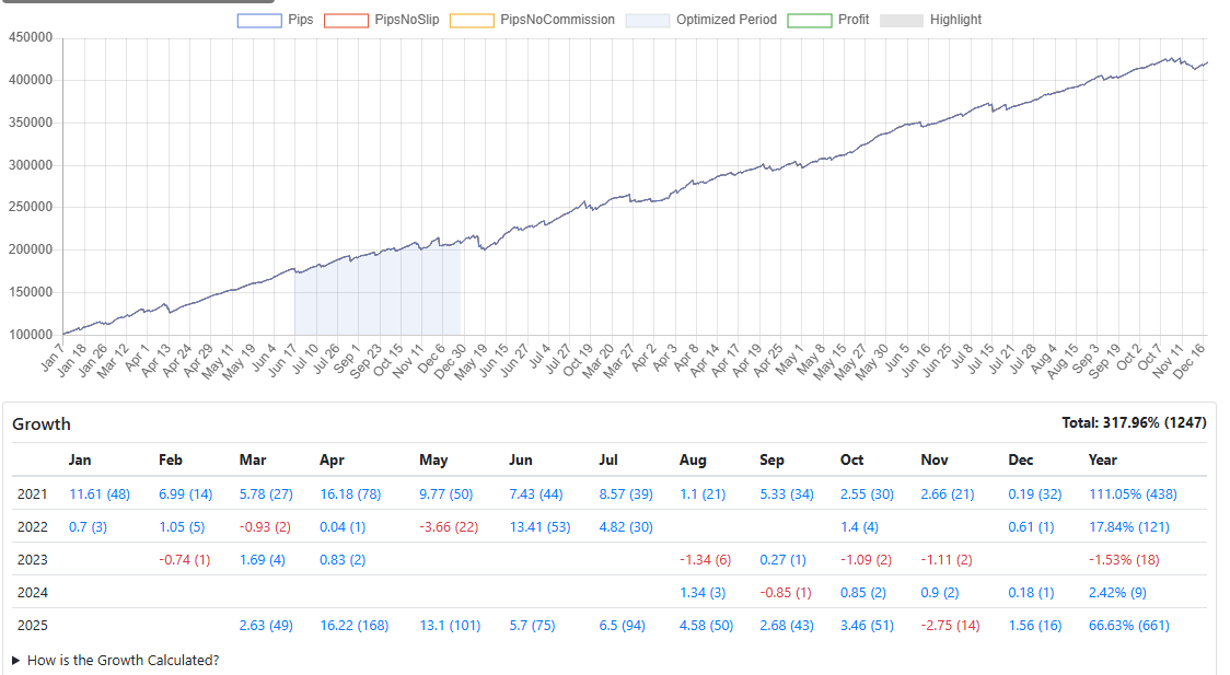 The image shows the same algo, same optimized period (blue section) and same symbol as the prevous image with the outlier filter applied (over the full period including the optimized period). Note that the image shows 1 year less data (year 2020 is absent). The profit is more or less the same as the no-filter/no-cusum (yellow line) the previous image but with considarable less drawdown. It can be seen in the monthly stats, there are periods with no or very few trades similar as that of the cusum image. Because there is no lag, the profit increased considerable over the cusum method.