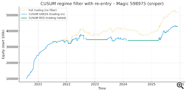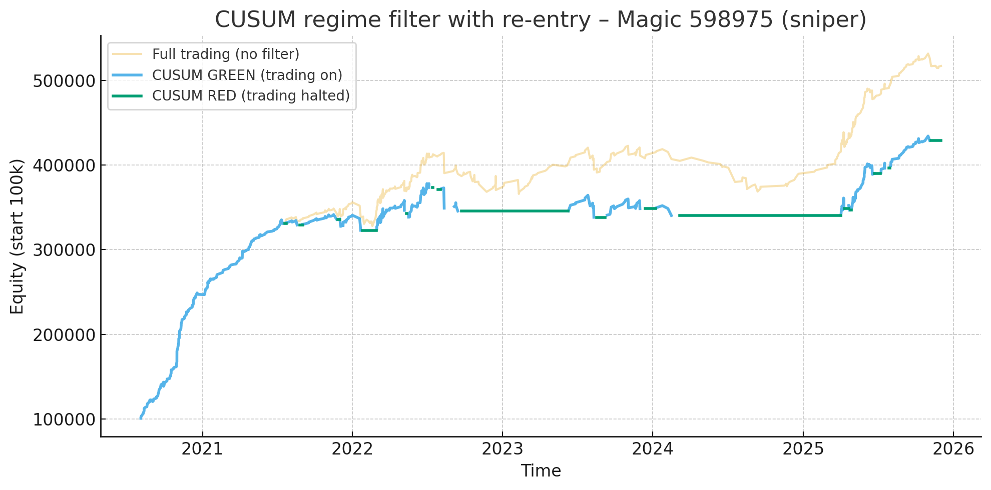 The math is basically Page's CUSUM test — standard SPC stuff, but I haven't seen much discussion of applying it to EA monitoring specifically. Most people either (a) eyeball equity, or (b) wait for X losing trades in a row, which is way too late.
