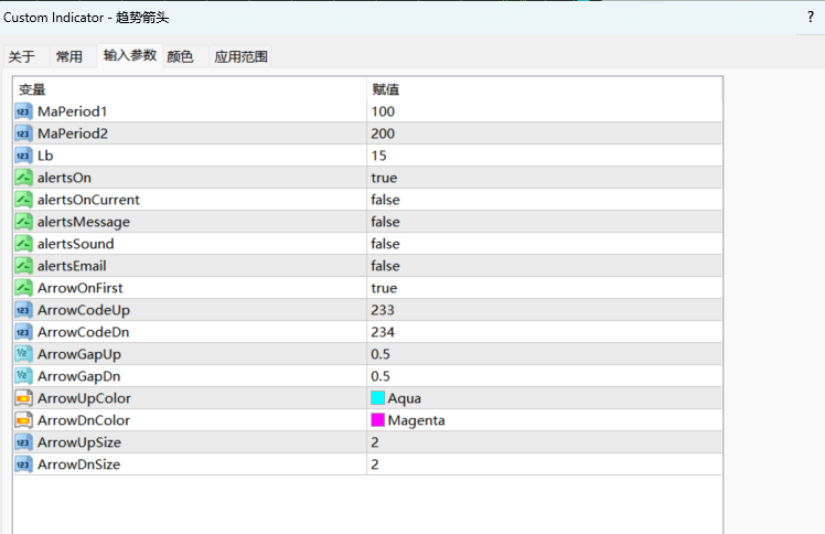Based on the inputs in your posted image, and merely the color of the arrows, it might be "Indicator Arrows"─or an even older version of it because the current 2016 version has more inputs:
