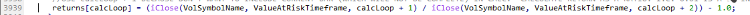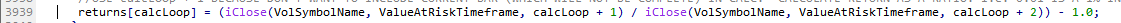 iClose fails and returns 0. As a result of dividing by 0, you assign inf to returns[calcLoop] (if checking floating point dividers is disabled and the EA didn't crash). If returns[calcLoop] affects the trading logic, it will lead to incorrect trading: