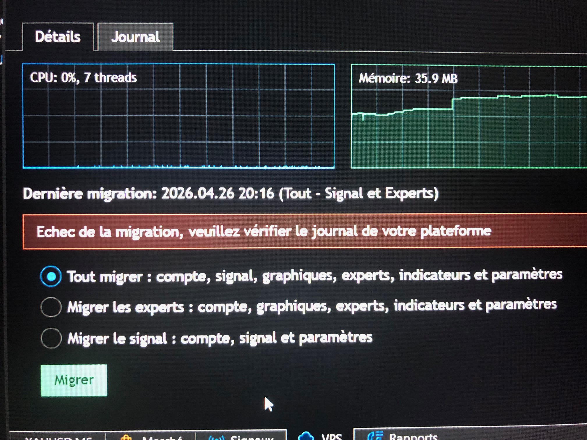 Faites comme indiqué dans le message, vérifiez le journal de votre terminal MT5 local pour détecter des messages ou des erreurs.