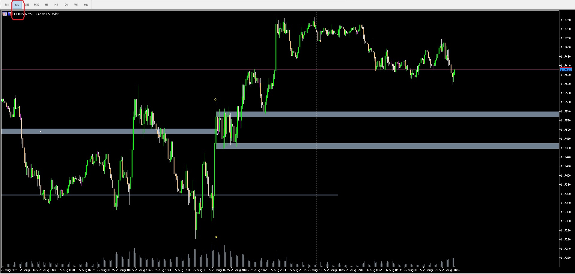 * Using the highest volume (histogram) at the end of every trading day and week (5 Min and H4)