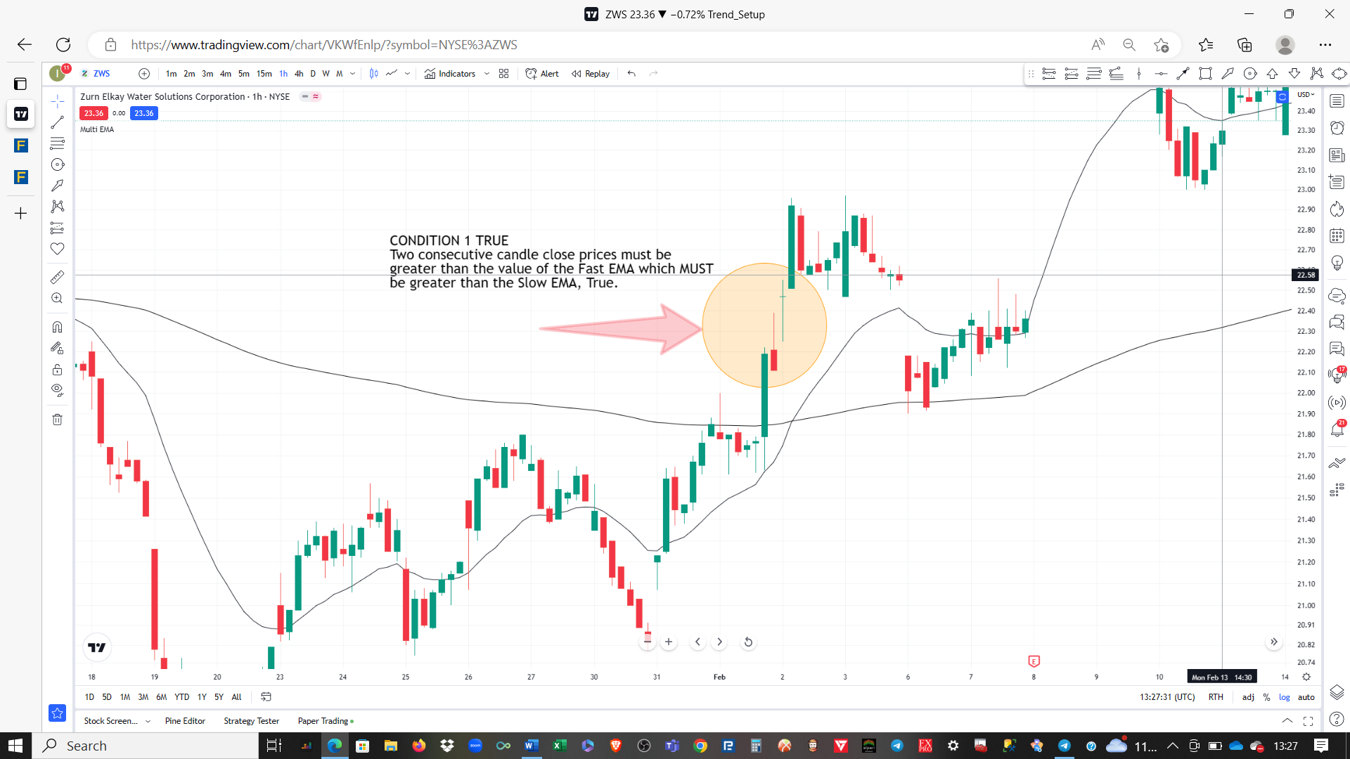 There must be two consecutive candle low and close prices must be greater than the value of the Fast EMA which MUST be greater than the Slow EMA.